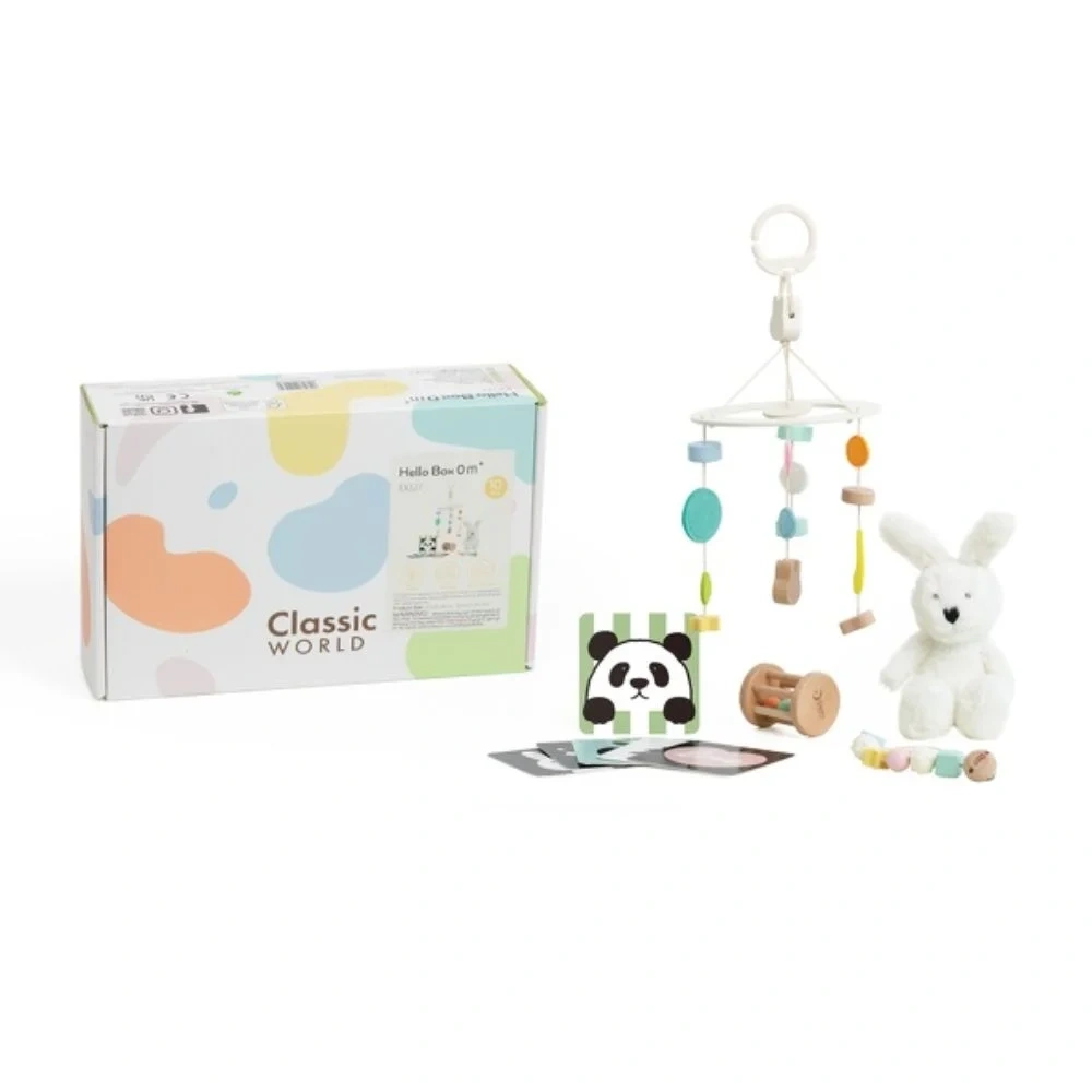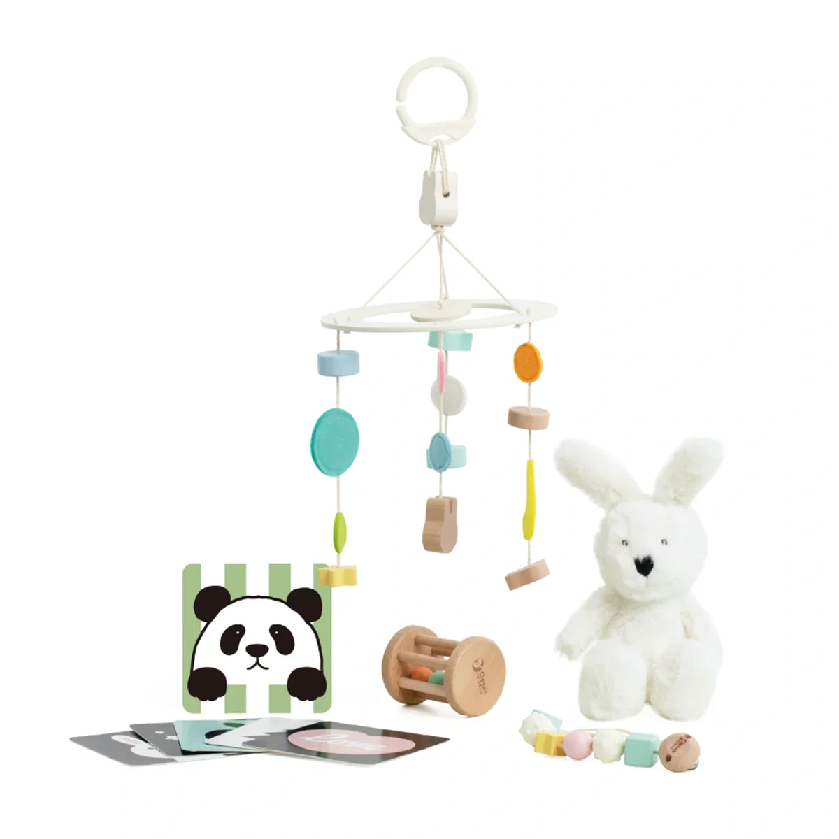 Set with various items for children from 0 to 6 months. The set contains a plush rabbit, mobile, black and white sensory cards, a pacifier cord and a rattle.