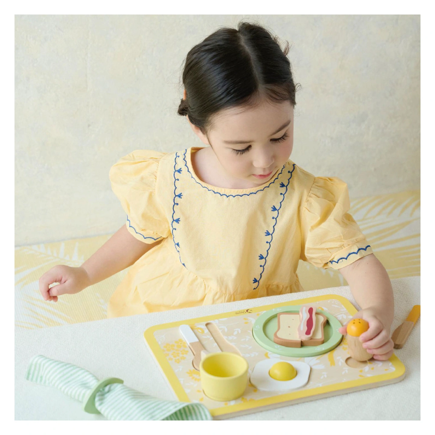 The set includes a separable poached egg, toast and bacon, knife, fork, and more! Offering many pretend play opportunities and ideas, this wonderful toy set also cultivates good table manners and well as social developmental factors.