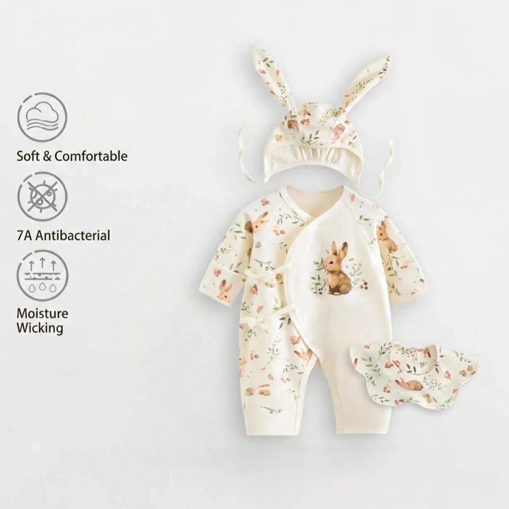 Complete Set: Includes 1x Patterned Jumpsuit, 1x Long-ear Bunny Hat, and 1x Floral Bib.
