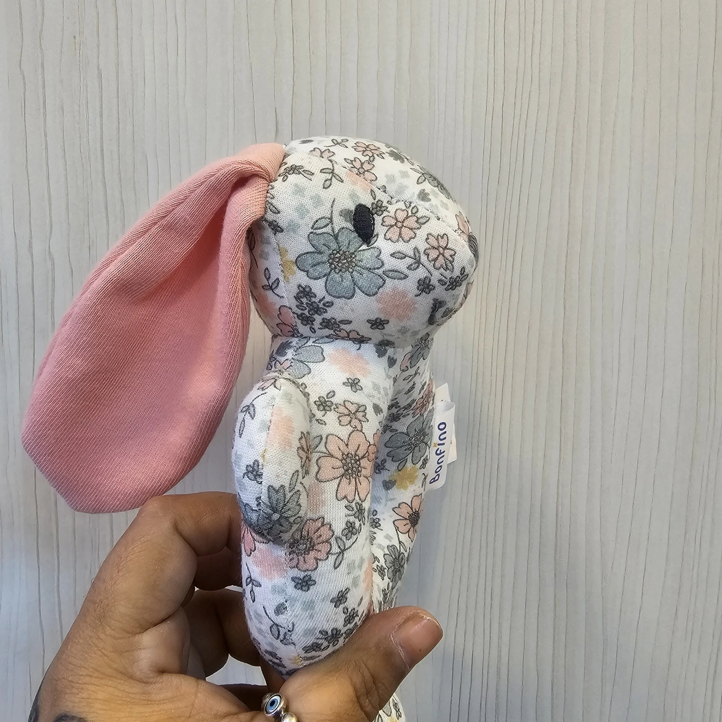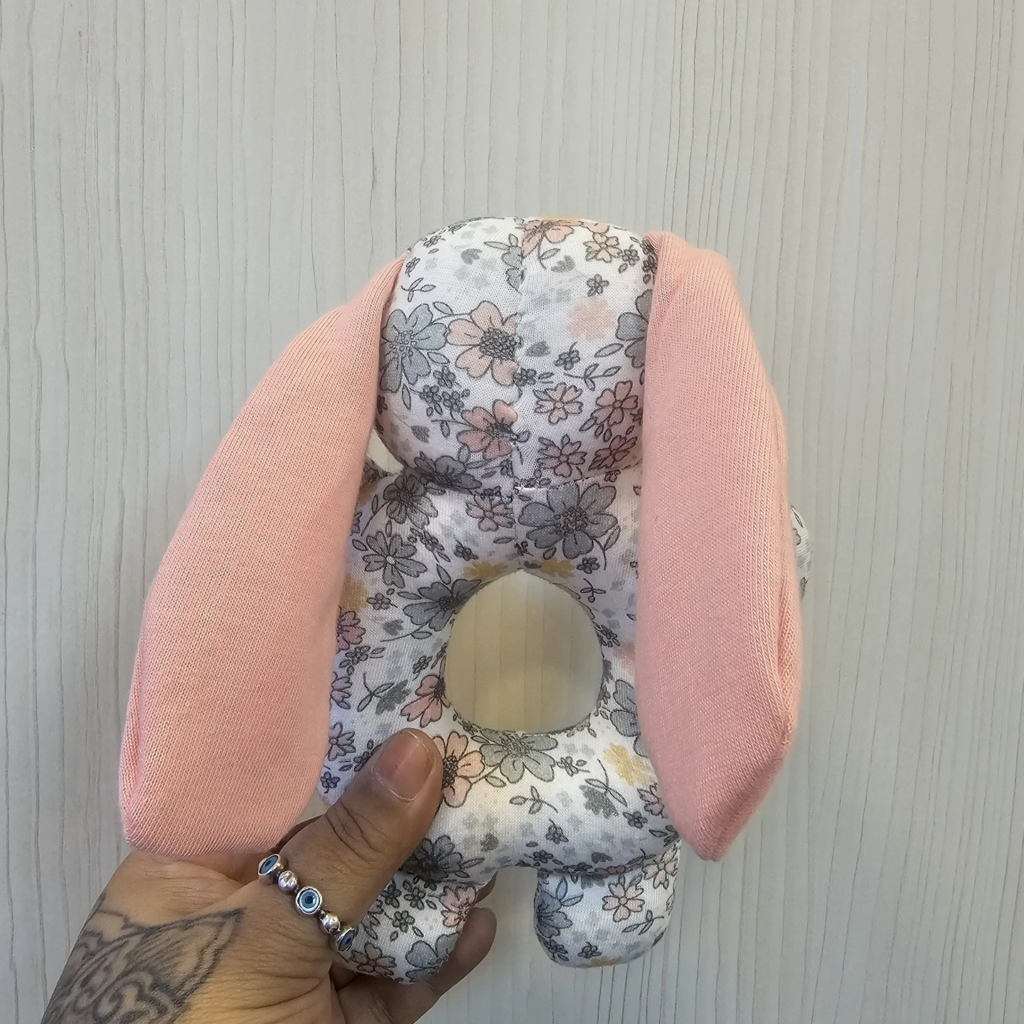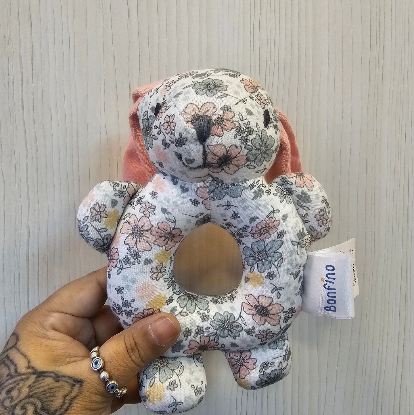 A soft bloom for your baby. This darling ring rattle is as sweet as a spring garden. Featuring a gentle "donut" design that is easy for little hands to hold, it is covered in a delicate floral print and topped with a sleepy bunny face. With soft pink ears and a gentle rattle sound, it is the perfect soothing companion for your little one.