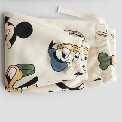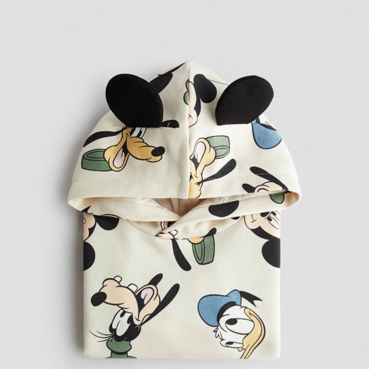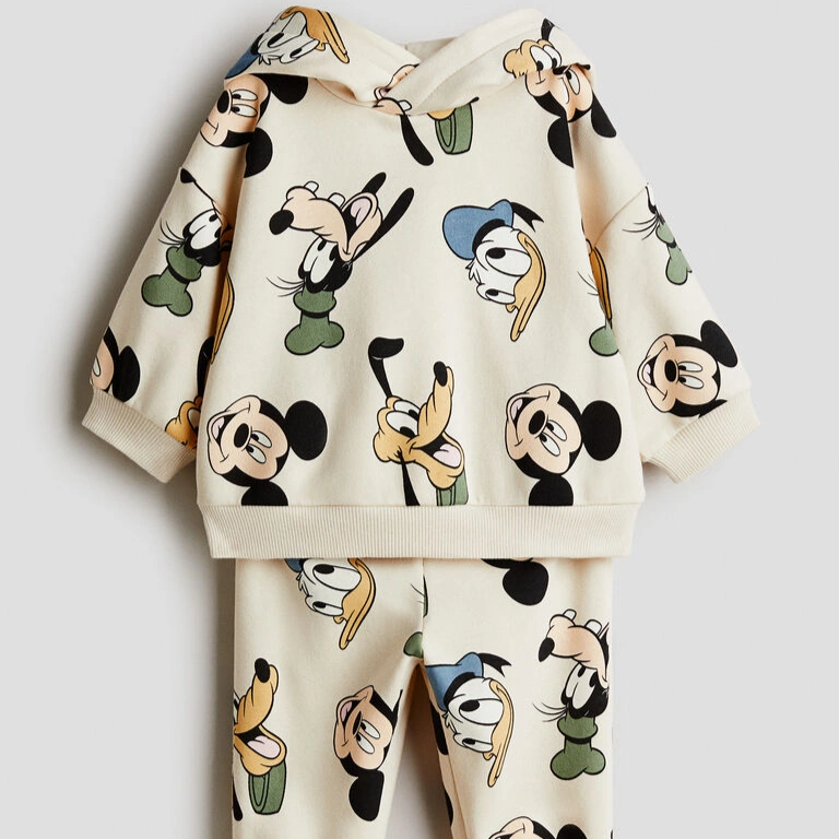 Set with a top and a matching pair of joggers in sweatshirt fabric with a soft brushed inside. Top featuring a lined hoodie with ear-shaped appliqués on top and a wrapover front, dropped shoulders and ribbing at the cuffs and hem. Joggers featuring elastication and a decorative drawstring at the waist and covered elastication at the hems.