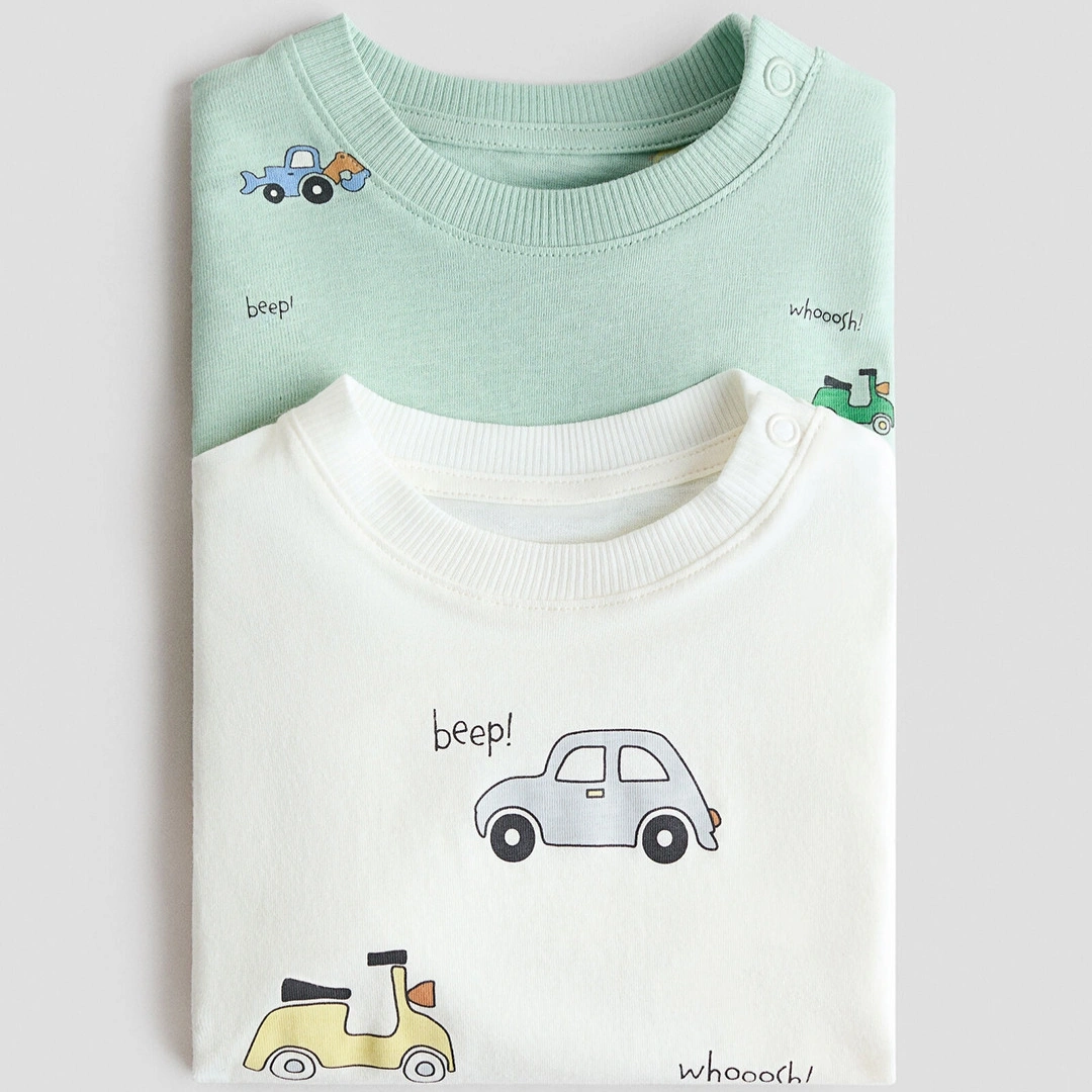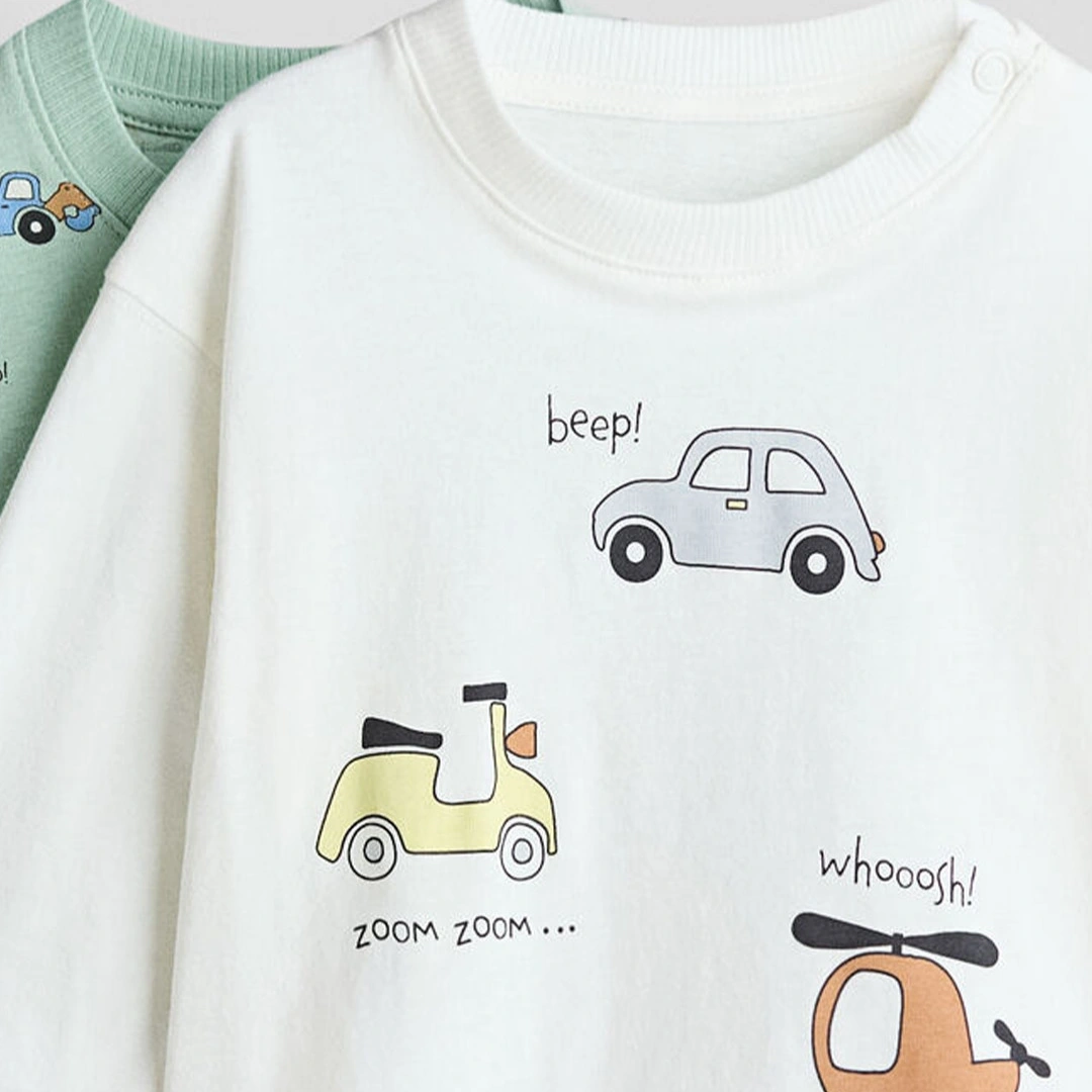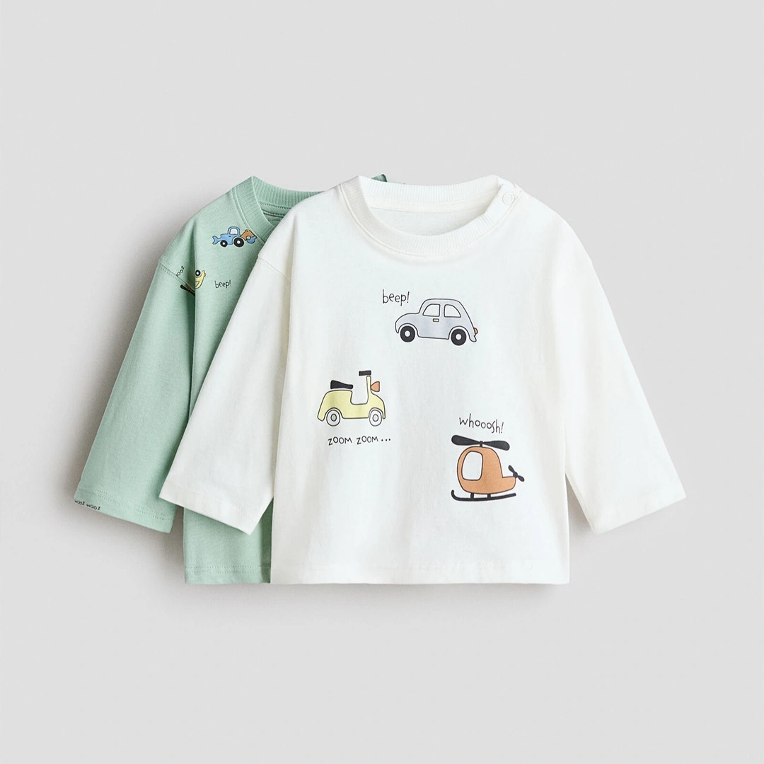 Long-sleeved T-shirts in soft cotton jersey with a printed design. Round, ribbed neck with snap fasteners on one side (sizes 2–4Y without snap fasteners) and dropped shoulders.