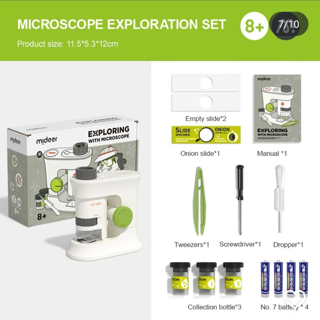 Including: 2 empty slides, 1 Onion slide, 3 collection bottles, 1 tweezer, 1 screwdriver, 1 dropper, 1 instruction