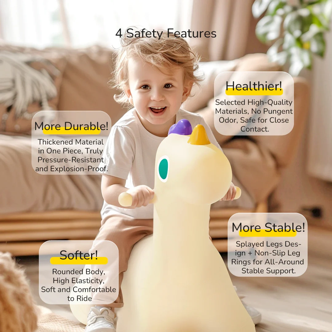 4 Safety Protection: The stable design includes outwardly angled legs with anti-slip rings, providing all-around stability and support. Its durable construction, made from thick, pressure-resistant material, guarantees long-lasting use and anti-burst performance. The toy is fully rounded with high elasticity, offering a soft and comfortable ride, while the use of high-quality, safe materials ensures it’s safe for close contact, with no harsh odors.