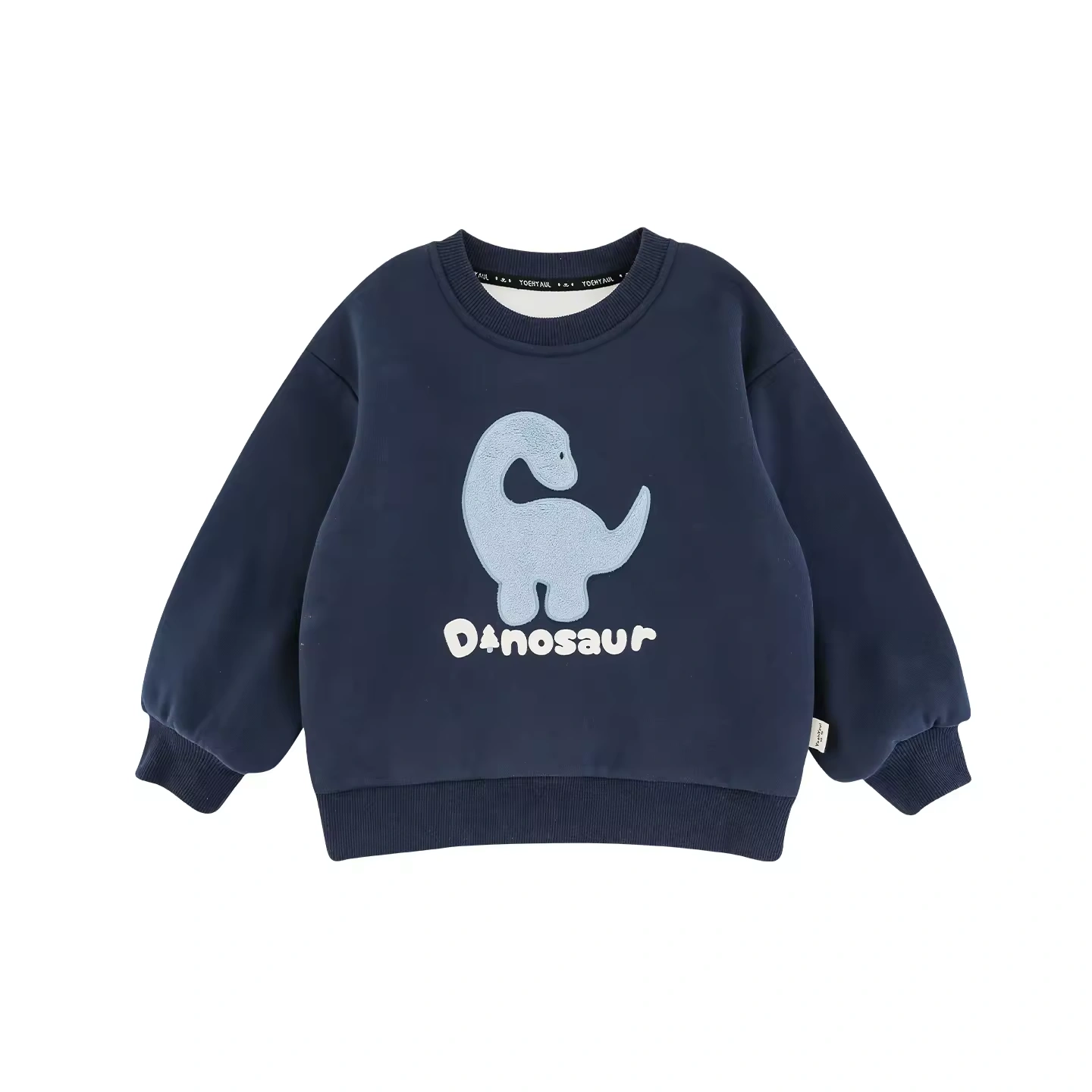Dino Blue: A rich navy sweatshirt featuring a light blue dinosaur and bold, bubbly "Dinosaur" text.